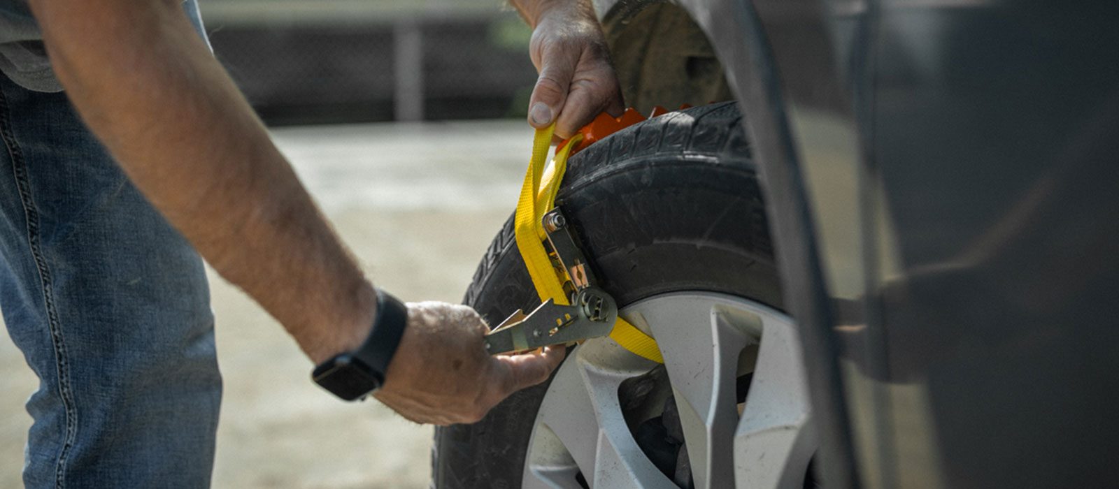 3. Ensure there is room between the tire rim and brake caliper so the strap won’t hit and tear. Pull down on the ratchet handle until the gripper is tight and won’t move any further